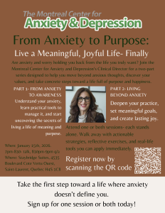Do you find yourself sometimes wondering what your purpose is? In this age, it can be hard to live life authentically, which in turn inhibits you from living a purposeful life. At The Montreal Center for Anxiety and Depression we have top specialists who can teach you to listen to your anxiety and reconnect with purpose. It would be our absolute pleasure to match you with a therapist who can help you live your life to the fullest.